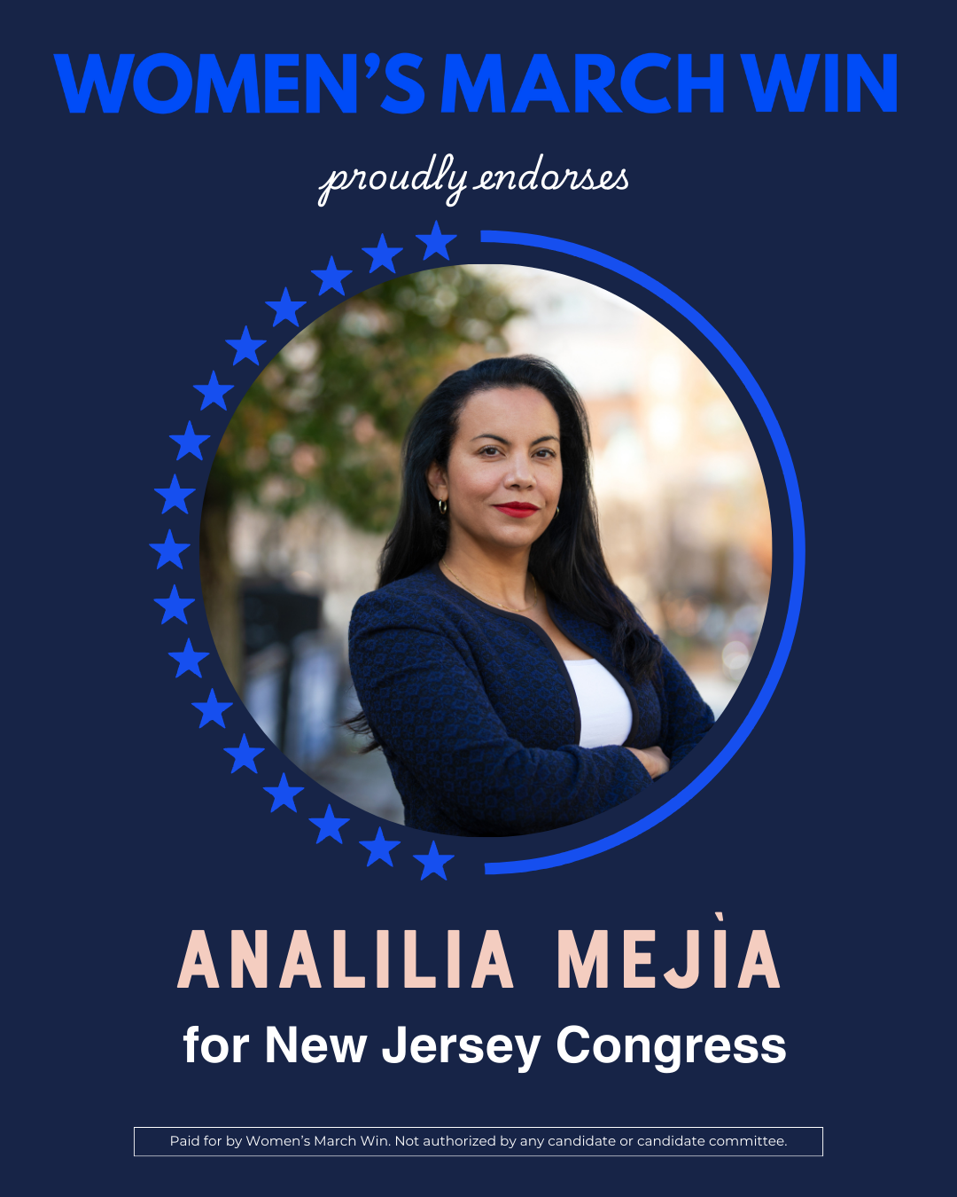 Women’s March WIN is proud to endorse Analilia Meija @analiliafornj for Congress. Analilia has been a stalwart champion for women and for working families, and is a staunch supporter of Women’s March and feminists everywhere.